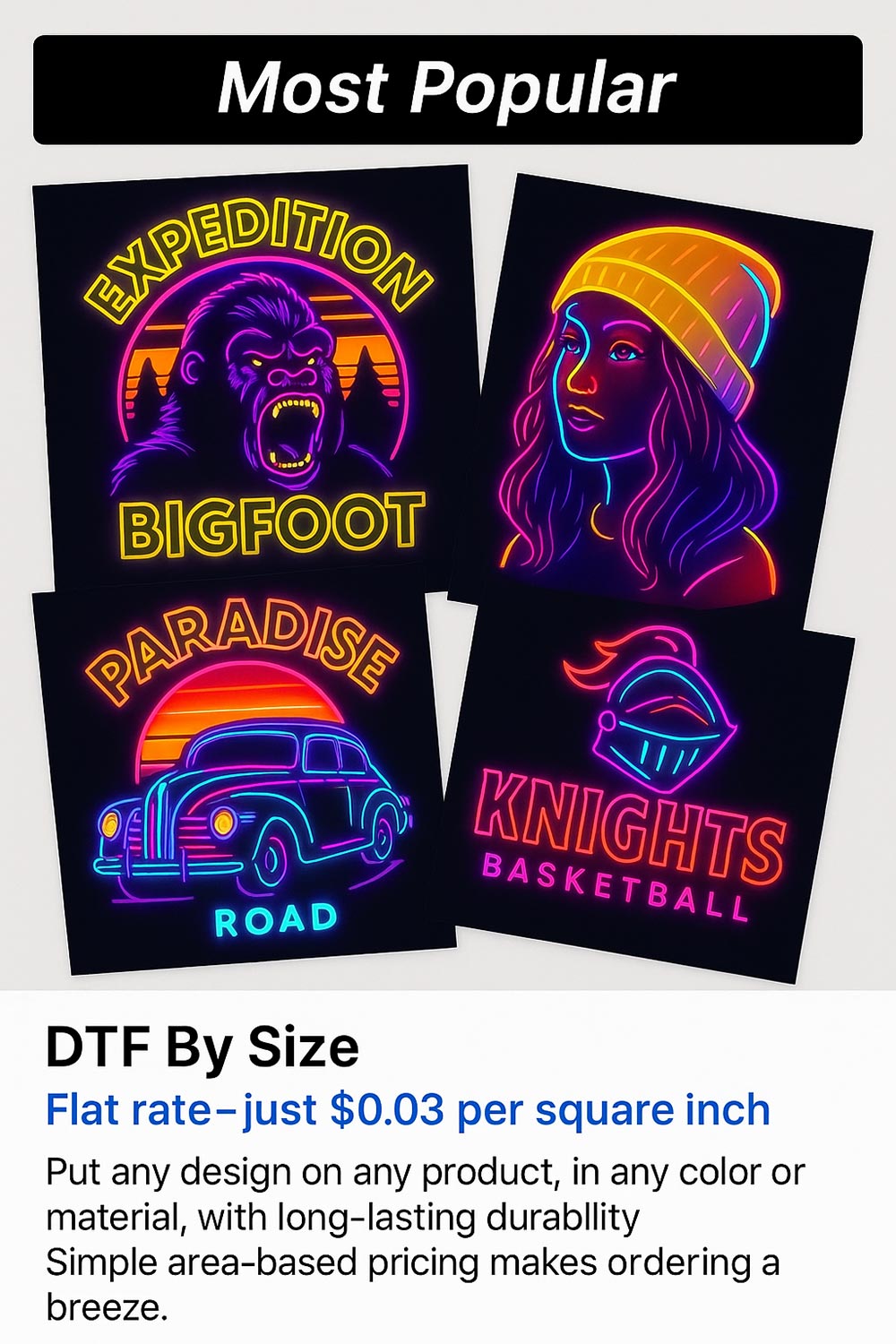 Color-Flare Neon DTF transfers produce ultra-Vivid colors that are far more vibrant than standard DTF printing, making your designs stand out like never before!