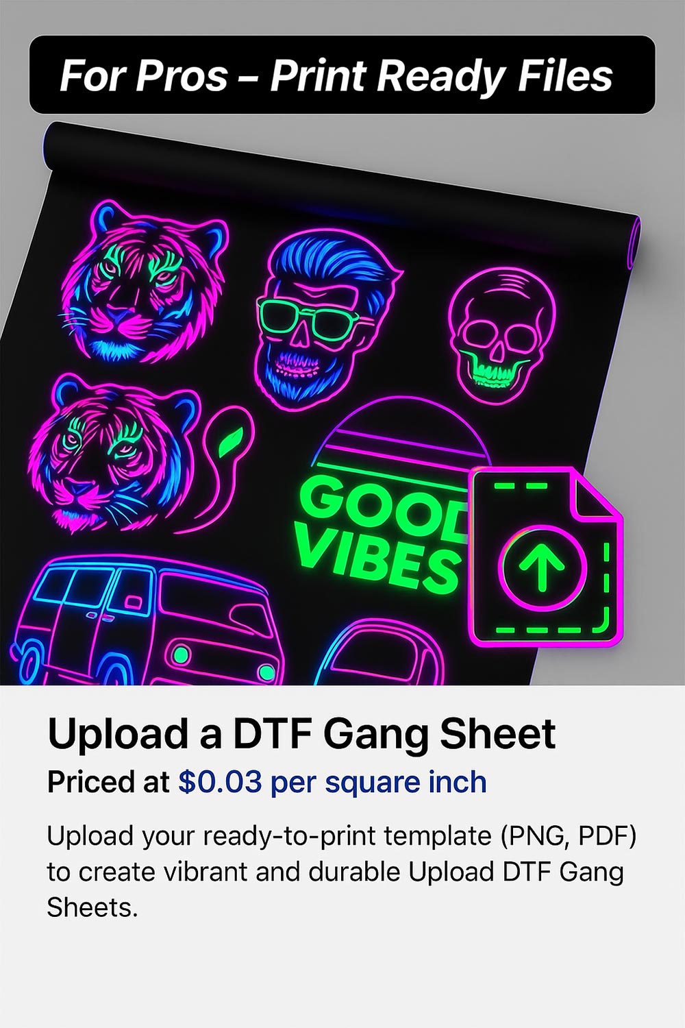 Accepted files types: .JPG for sublimation , PNG for DTF, PDF for raised UV stickers
